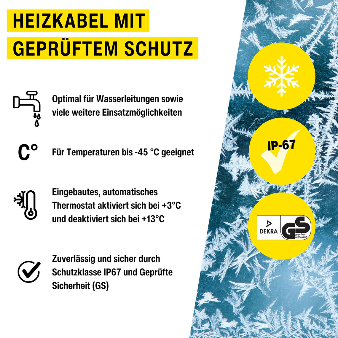 Die horizont Heizkabel haben ein integriertes Thermostat, das zur Temperaturerkennung dient. Es schaltet sich bei +3 °C ein und ab +13 °C automatisch aus. Eine zusätzliche Isolierung hält das Wasserrohr bis zu einer Temperatur von -45 °C frostfrei. Dabei sollte darauf geachtet werden, dass das Thermostat mit isoliert wird. Die 230 V Spannung versorgt das Heizkabel mit Strom und lässt eine Leistung von 17 bis 768 W zu.