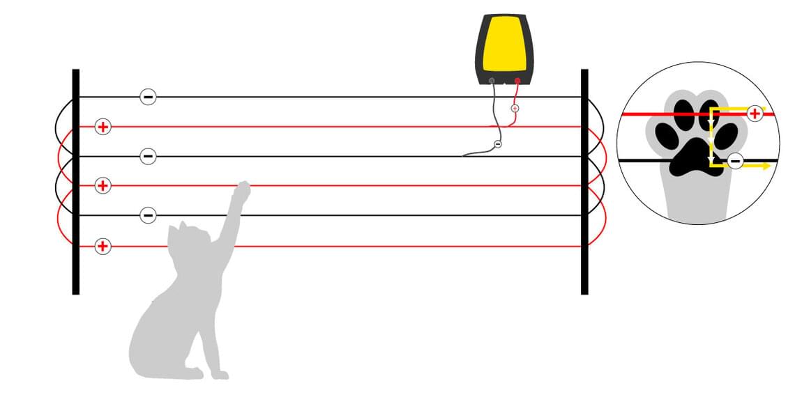 Das Prinzip eines elektrischen Weidezauns besteht darin, dass bei Berührung des Leitermaterials der Stromkreis geschlossen wird. Bei einem normalen Weidezaun wird das durch die Erdung und den Bodenkontakt des eingezäunten Tieres erreicht. Hat das zu hütende Tier keinen Kontakt zum Boden, muss auf ein anderes Konzept zurückgegriffen werden: den Plus-minus-Zaun.