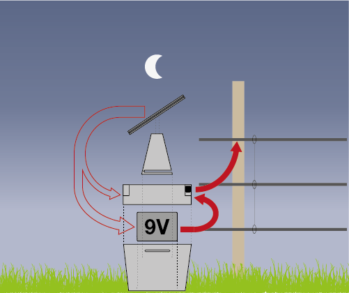 - Betrieb des Weidezaungerätes nachts über eine angeschlossene 9 V Batterie