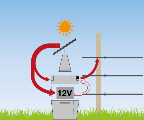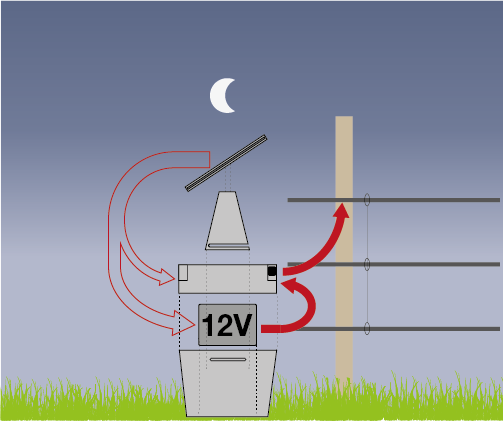 - Betrieb des Weidezaungerätes tagsüber bei ausreichend Sonneneinstrahlung über das Solarpanel und gleichzeitiges Laden des angeschlossenen 12 V Akkus