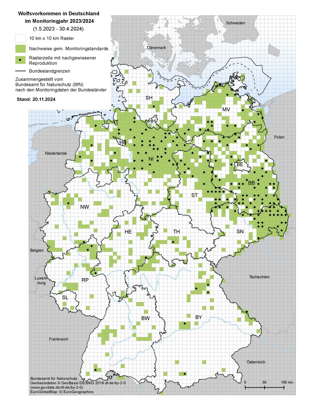 Die Bundesländer sammeln Nachweise von Wölfen, um die Entwicklung der Population zu dokumentieren. Die Dokumentations- und Beratungsstelle des Bundes zum Thema Wolf trägt diese Daten zusammen und veröffentlich jährlich einen Statusbericht. Nach dem jüngsten Bericht (2023/24) leben in Deutschland neben 209 Rudeln zusätzlich 46 Wolfspaare sowie 19 sesshafte Einzelwölfe.