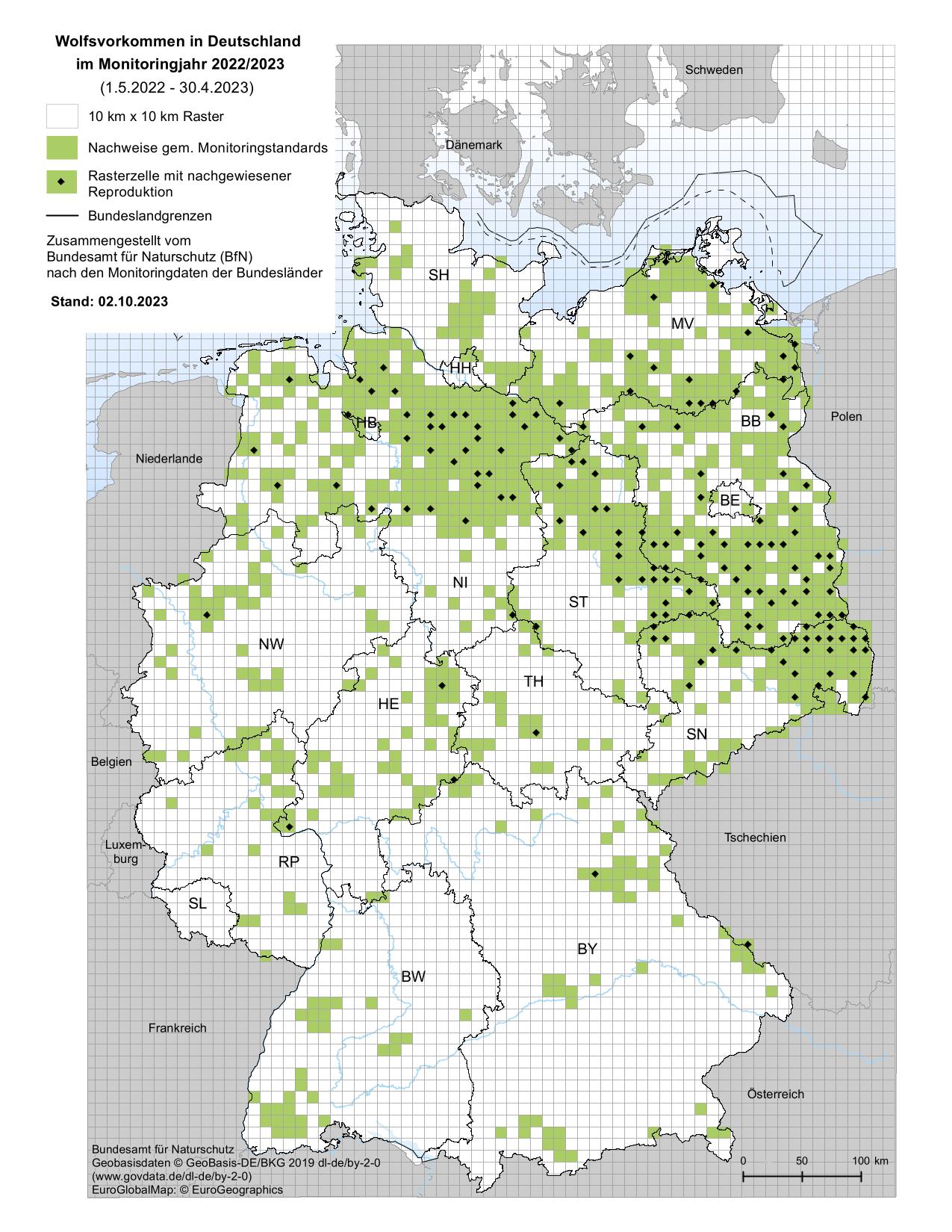 Die Bundesländer sammeln Nachweise von Wölfen, um die Entwicklung der Population zu dokumentieren. Die Dokumentations- und Beratungsstelle des Bundes zum Thema Wolf trägt diese Daten zusammen und veröffentlich jährlich einen Statusbericht. Nach dem jüngsten Bericht (2022/23) leben in Deutschland 184 Wolfsrudel, 47 Paare und 22 territoriale Einzeltiere.