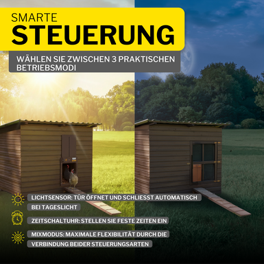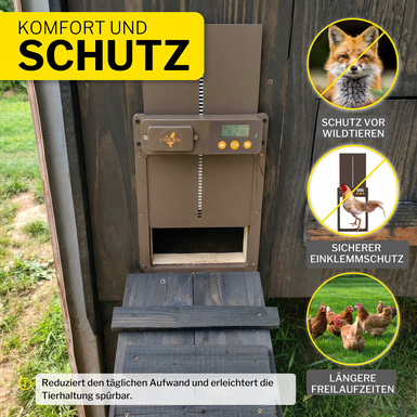 Mit der automatischen Hühnerklappe bestimmen Sie ganz unkompliziert, wann sich Ihre Hühnerstalltür öffnet und schließt. Die Hühnertür ermöglicht Ihren Tieren somit viel Zeit an der frischen Luft und schützt sie in der Nacht effektiv vor ungewollten Eindringlingen - volle Flexibilität und Sicherheit für Sie als Tierhalter.