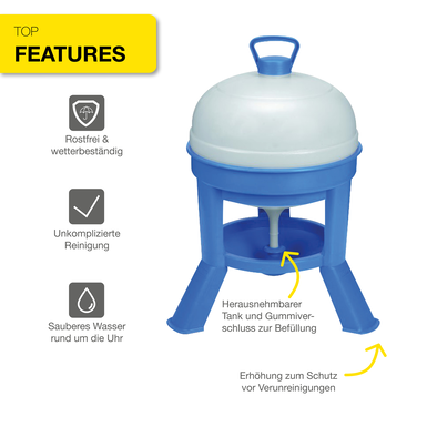 Dank des cleveren Designs mit Standbeinen bleibt das Wasser geschützt vor Verschmutzungen am Boden. Der integrierte Griff erleichtert das Befüllen und Transportieren, sodass die tägliche Wasserversorgung deiner Tiere unkompliziert und zeitsparend gelingt. Der Tank ist herausnehmbar, lässt sich mit einem Gummiverschluss sicher verschließen und bequem zum Befüllen entnehmen.