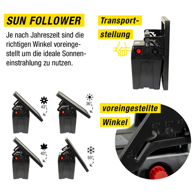 - Optimale Sonnenenergie-Nutzung durch 4 einstellbare Panel-Anstellwinkel + Transportstellung