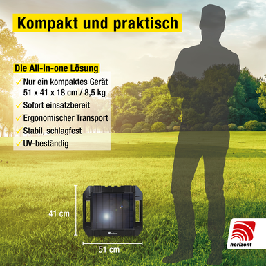 Auch ohne Sonneneinstrahlung / Solarmodul kann das Gerät eine Hütesicherheit von 8,5 Tagen sicherstellen. Ein schlechtes Zaunsystem oder starker Bewuchs können die Laufzeit reduzieren. Mit einem zweiten Akku verdoppelt sich die Laufzeit.