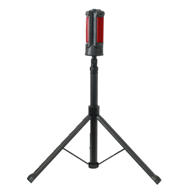 Flexible Aufstellung: Höhenverstellbares Aluminiumstativ (85–175 cm), integrierter Aufhängehaken und starke Magnethalterungen.