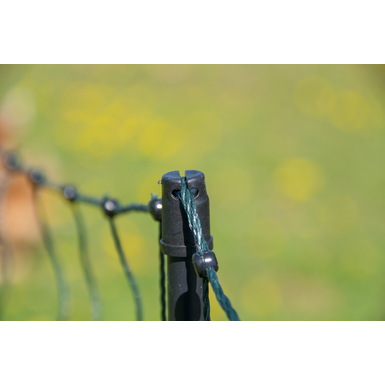 Aber nicht nur die neuen Fiberglaspfähle, die verstärkten Ober- und Unterlitzen, die hochwertigen Doppelspitzen und der enge Maschenabstand machen das strong line Hühnernetz zu einem Premiumprodukt. Auch der integrierte Bodenstopper verbessert den Zaun, hält das Netz konstant am Boden und verhindert das Unterkriechen der Tiere. Darüber hinaus verfügt jeder Pfahl über einen Kopfisolator, der die Oberlitze auch bei Wind und Wetter sicher führt und so neben der notwendigen Zugspannung auch für die Hütesicherheit und einen festen Stand sorgt.