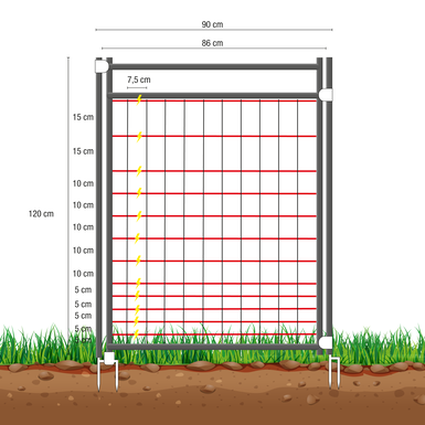 Das Netz der Tür ist elektrifizierbar und garantiert absolute Hütesicherheit. Der Rahmen dagegen ist isoliert und erlaubt ein einfaches und sicheres Öffnen und Schließen des Tors, ohne den Strom abschalten zu müssen.