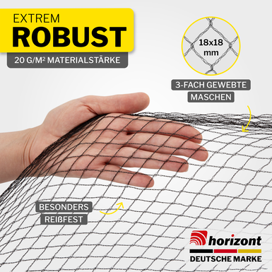 Gefertigt aus reißfestem Polyethylen (20 g/m²) ist das Netz witterungsbeständig, UV-stabil und formstabil. Es verknotet nicht und bleibt über Jahre hinweg zuverlässig im Einsatz – ideal für jede Jahreszeit.