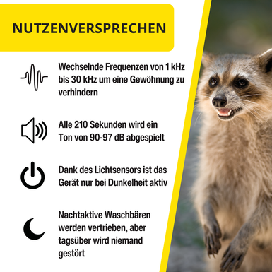 - Ultraschall-Technologie – unangenehm für Waschbären, aber unschädlich