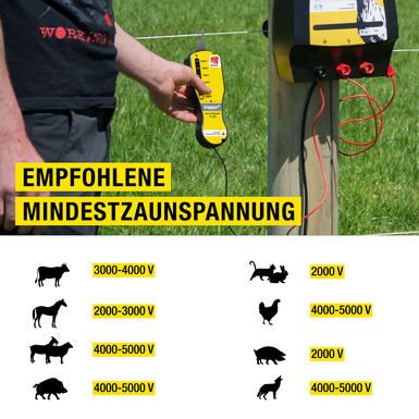 Dies gewährleistet eine einfache Handhabung und bietet einen zusätzlichen Schutz gegen Schäden. Der Zaunprüfer benötigt keine Batterie!