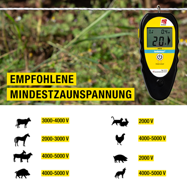 Somit finden Sie schnell die „undichten“ Stellen in Ihrer Zaunanlage. Das Gerät hat eine Displaybeleuchtung und eine akustische Anzeige für Strom auf dem Draht.