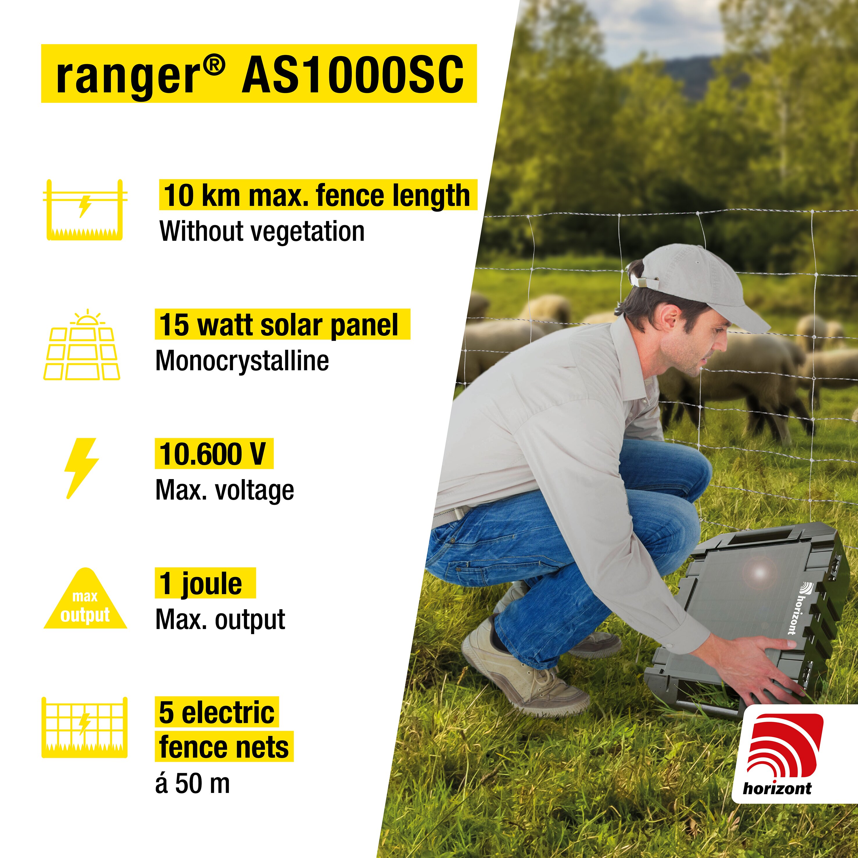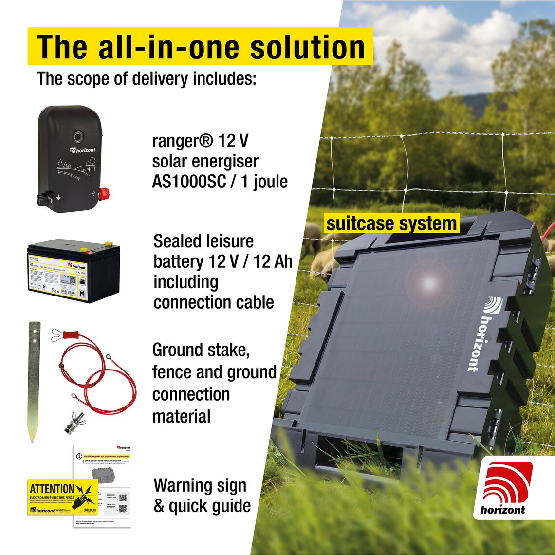horizont Animal Care is starting the new year with an innovation: with the ranger® AS1000SC and AS1800SC polycarbonate electric fence systems, the high-quality monocrystalline solar panel is integrated into the housing of the electric fence energiser. This means you get all the components you need to electrify your electric fence in one compact case: a solar panel integrated in the case lid, an electric fence energiser, a battery, fence and ground connection material, a ground stake and a warning sign.