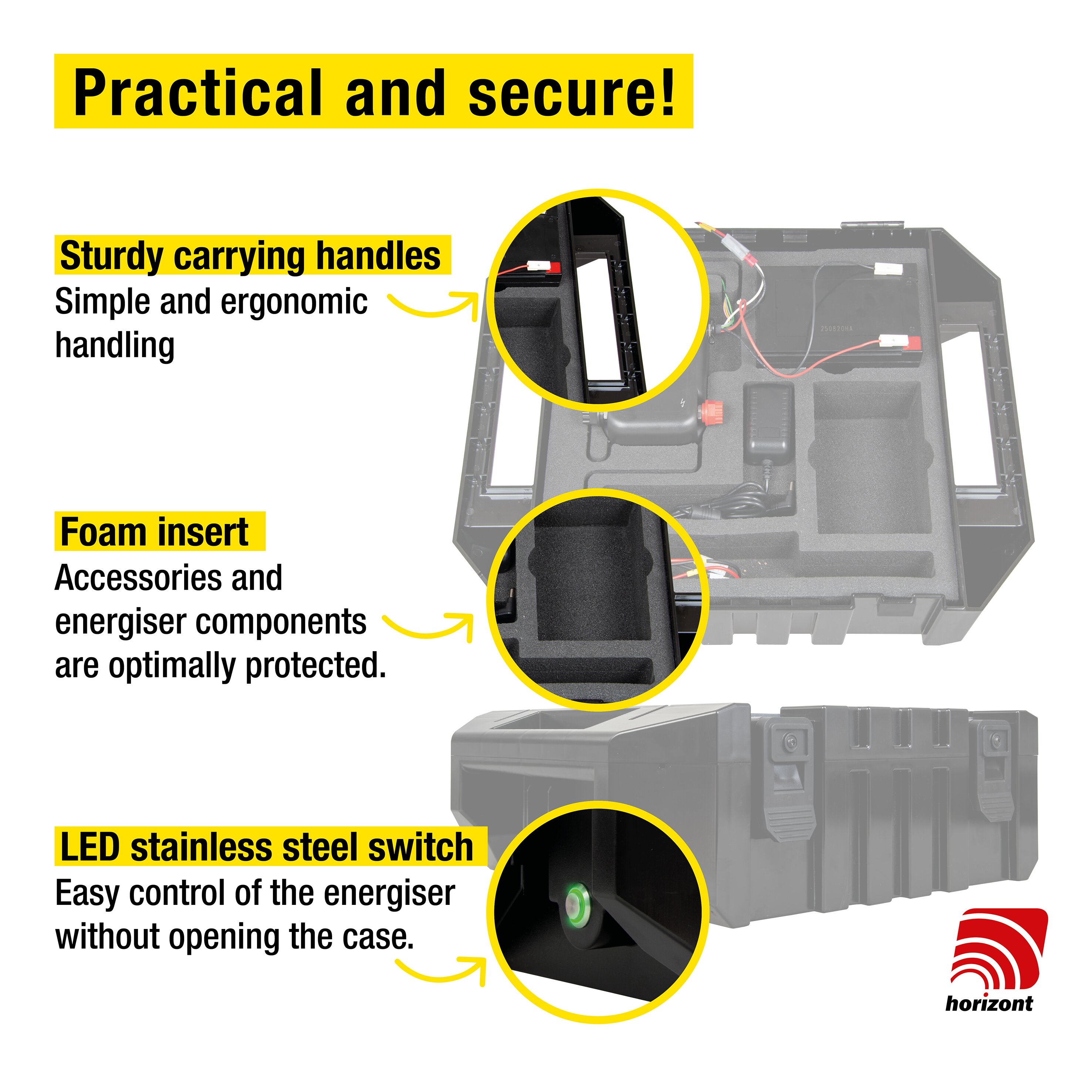 The interior offers space for a second rechargeable battery (optional) and other accessories. For example, a fence tester or a power supply unit for mains operation can also be stored in the case. A sturdy foam insert with precisely fitting cut-outs ensures that all components remain in place during transport and nothing slips around.