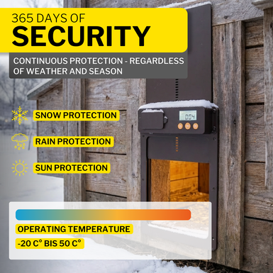 It also has an animal detection function that detects the possible presence of chickens when the door closes slowly (this function is not activated when the door is closed manually). When the door is automatically closed and it detects an obstacle, the door automatically opens again and then closes. This attempt is repeated up to three times.