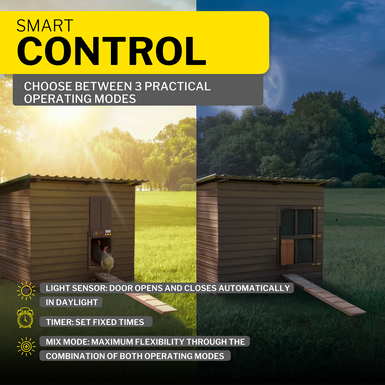 You can control the opening and closing of the chicken coop with this easy-to-install door, which is controlled by a timer or light probe. You can either use the standard mode, which detects the ambient brightness using the light sensor, or opt for the programmable time mode (12 or 24 hours). Of course, it is also possible to open and close the door manually with the push of a button.