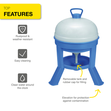Thanks to the clever design with legs, the water remains protected from dirt on the floor. The integrated handle makes it easy to fill and transport, making the daily water supply for your animals uncomplicated and time-saving. The tank is removable, can be securely closed with a rubber cap and is easy to remove for filling.