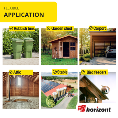 Protect your home reliably against raccoons! The horizont raccoon repellent works with highly effective ultrasonic sounds. Thanks to the integrated light sensor, the device is only active in the dark - no sounds are emitted during the day, the battery is conserved and at the same time nobody is disturbed by ultrasonic sounds. Animal-friendly, effective and chemical-free - the ideal solution for attics, gardens and especially rubbish bins.