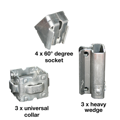 The set consists of three robust aluminium moulded parts that can be put together in a few simple steps. The construction creates a stable framework principle that permanently reinforces your fence system.